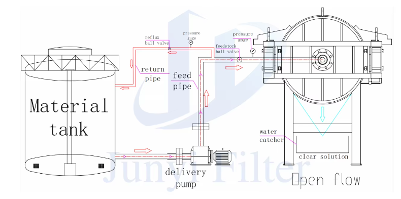 C、Liquid discharge methods-Close flow: there are 2 close flow main pipes below the feed end of the filter press and if the liquid needs to be recov...