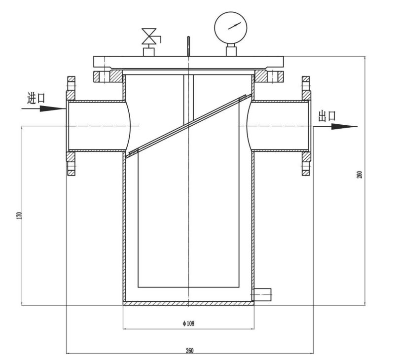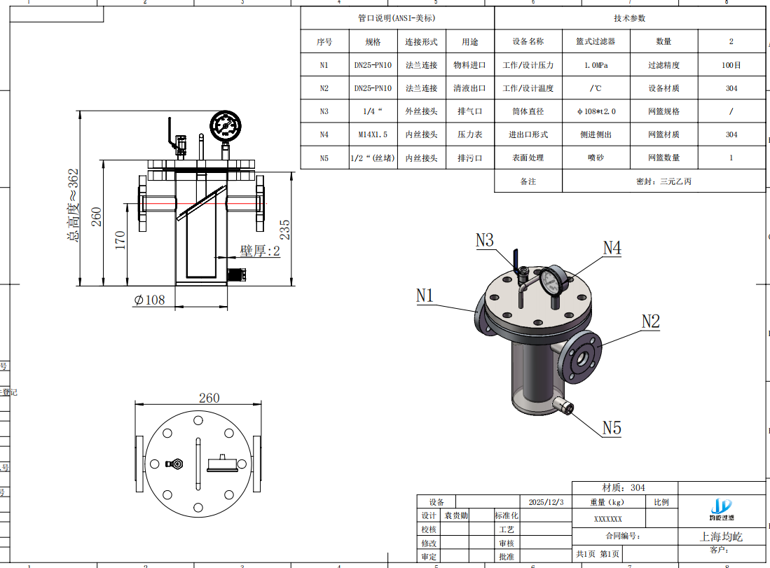 In the design process, the technical team fully considered the practicability and stability of the industrial scene: in view of the media impurity interception requirements that customers may face, the filter basket accuracy of 100 mesh (corresponding to 150 microns) is specified to ensure efficient interception of impurities; Adapt to the pipe installation specification, set the import and export specifications to 1-inch American standard flange, improve the compatibility of the equipment with the customer’s existing system; At the same time, the structure layout of the equipment is optimized, and 1/2 inch sewage outlet and 1/4 inch exhaust outlet are added to solve the problem of residue discharge and air retention in the filtration process, and ensure the smooth filtration process. After the completion of the design drawing, timely synchronous customer confirmation, in view of the details of the customer questions for professional answers, and finally reach a consensus, lay a solid foundation for subsequent production.